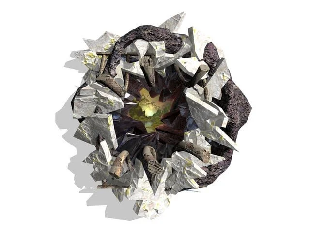 I am struck by how unfazed Burton is by suggestions of what his sculptures look like, make one think of, or indeed mean. He does have qualifications: he admits the sci-fi, stage-prop look of them, but points out that they have further-reaching intentions. He admits their comic aspects, but insists also on their seriousness. While he describes his work – makes it, I think – in terms of geology, both sculptures here look as if they are about to leap into life, like the rocks in a sci-fi film turning into creatures. He aims to make things that look like fragments or excavated things, but which are more fluid, and appear to ʻcreate themselves.ʼ He adds: ʻas if from another dimension, with an alien presence.ʼ And he doesnʼt want to be billed as one those artists who worthily effect a meeting of art and science. ʻSci-artʼ as itʼs known (nothing to do with science fiction) isnʼt what heʼs aiming for at all. ʻI hate it,ʼ he tells me. About Cern, he comments, interestingly, ʻI was astonished by how decorative the things they were building were.ʼ